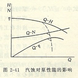 若離心泵在發(fā)生汽蝕時繼續(xù)運轉(zhuǎn),由于氣泡的存在,會導致離心泵流量下降,同時,泵的揚程、救率也急劇降低,破壞正常操作。圖2—41的實線為泵正常工作時的性能曲線,虛線部分為發(fā)生汽蝕