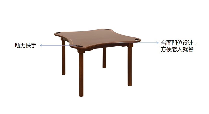 餐桌 基材:為實(shí)木白蠟?zāi)究蚣芙Y(jié)構(gòu) 臺(tái)面凹位設(shè)計(jì),便于輪椅長(zhǎng)者就餐 四角設(shè)有助力拉手孔,便于借力 桌角大圓角設(shè)計(jì),減低碰撞傷害,拆裝結(jié)構(gòu),便于運(yùn)輸。