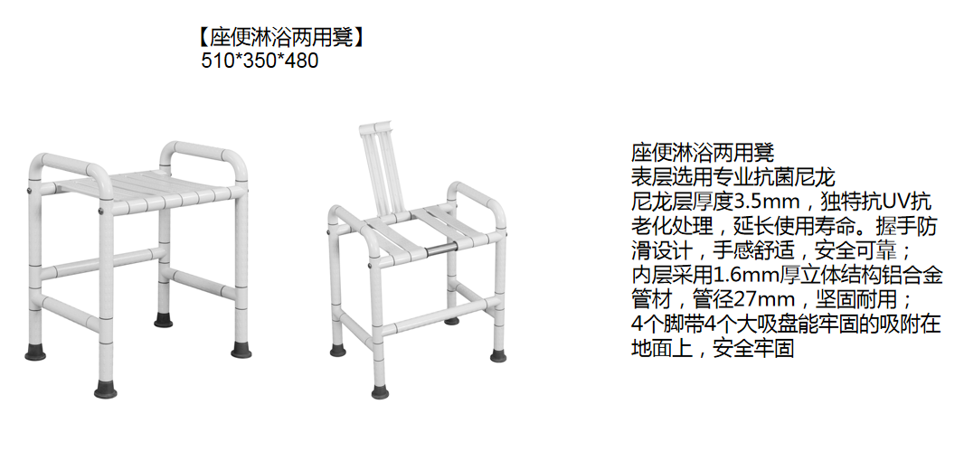 座便淋浴兩用凳 表層選用專業(yè)抗菌尼龍 尼龍層厚度3.5mm,獨特抗UV抗老化處理,延長使用壽命。握手防滑設(shè)計,手感舒適,安全可靠; 內(nèi)層采用1.6mm厚立體結(jié)構(gòu)鋁合金管材,管徑27mm,堅固耐用; 4個腳帶4個大吸盤能牢固的吸附在地面上,安全牢固