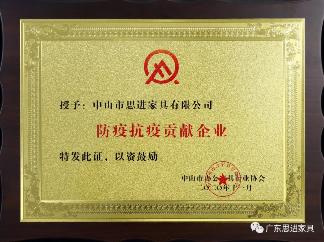 2020年一場新冠疫情突然襲來,打亂了我們生活與工作的節(jié)奏,雖然我們遇到了很多困難,但思進家具一直秉承自己的企業(yè)愿景和核心價值觀:承擔社會責任,實現(xiàn)國富民強。思進人齊心協(xié)力,向中山市紅十字會捐出10萬元作為抗疫善款,協(xié)會特授予思進家具“防疫抗疫突出貢獻獎”。